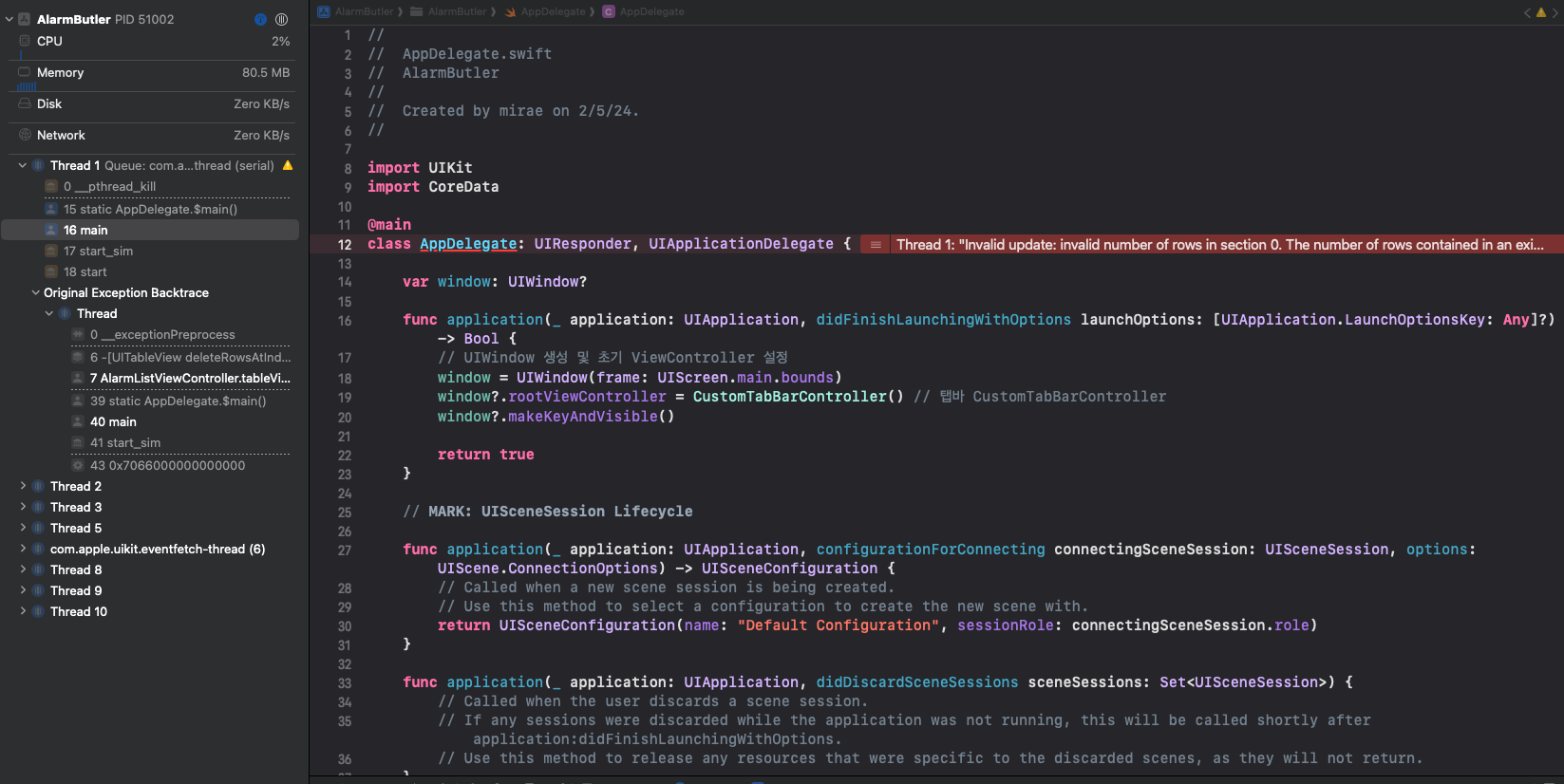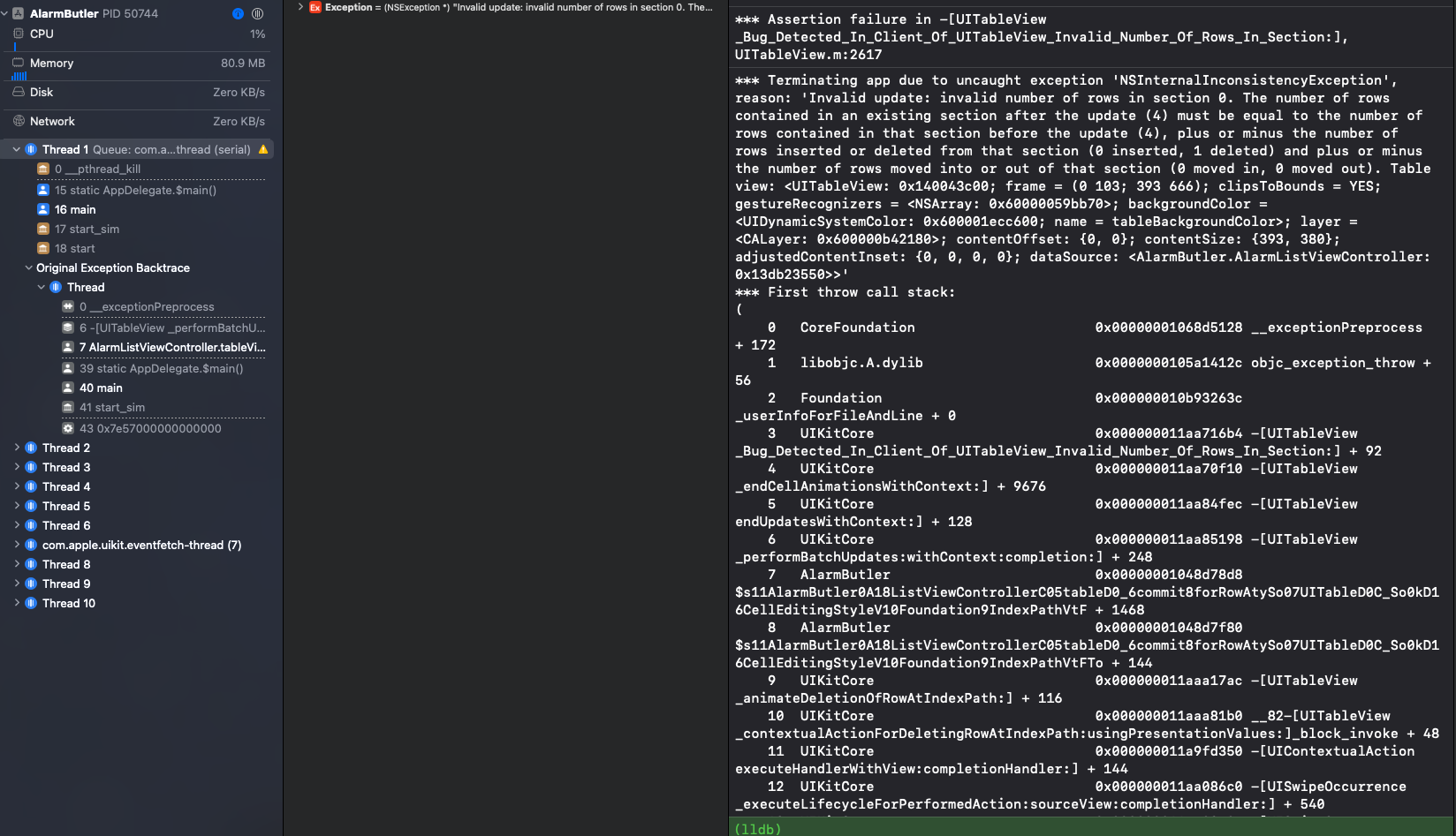 *** Terminating app due to uncaught exception 'NSInternalInconsistencyException', reason: 'Invalid update: invalid number of rows in section 0. The number of rows contained in an existing section after the update (4) must be equal to the number of rows contained in that section before the update (4), plus or minus the number of rows inserted or deleted from that section (0 inserted, 1 deleted) and plus or minus the number of rows moved into or out of that section (0 moved in, 0 moved out). Table view: <UITableView: 0x140043c00; frame = (0 103; 393 666); clipsToBounds = YES; gestureRecognizers = <NSArray: 0x60000059bb70>; backgroundColor = <UIDynamicSystemColor: 0x600001ecc600; name = tableBackgroundColor>; layer = <CALayer: 0x600000b42180>; contentOffset: {0, 0}; contentSize: {393, 380}; adjustedContentInset: {0, 0, 0, 0}; dataSource: <AlarmButler.AlarmListViewController: 0x13db23550>>'
