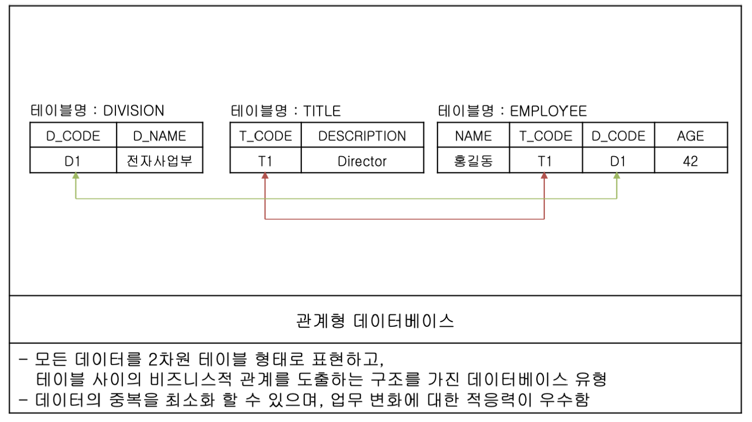 - 내용에 따른 참조(Reference By Content) : 데이터베이스에 저장된 데이터는 데이터의 물리적 위치가 아니라 데이터 값에 따라 참조