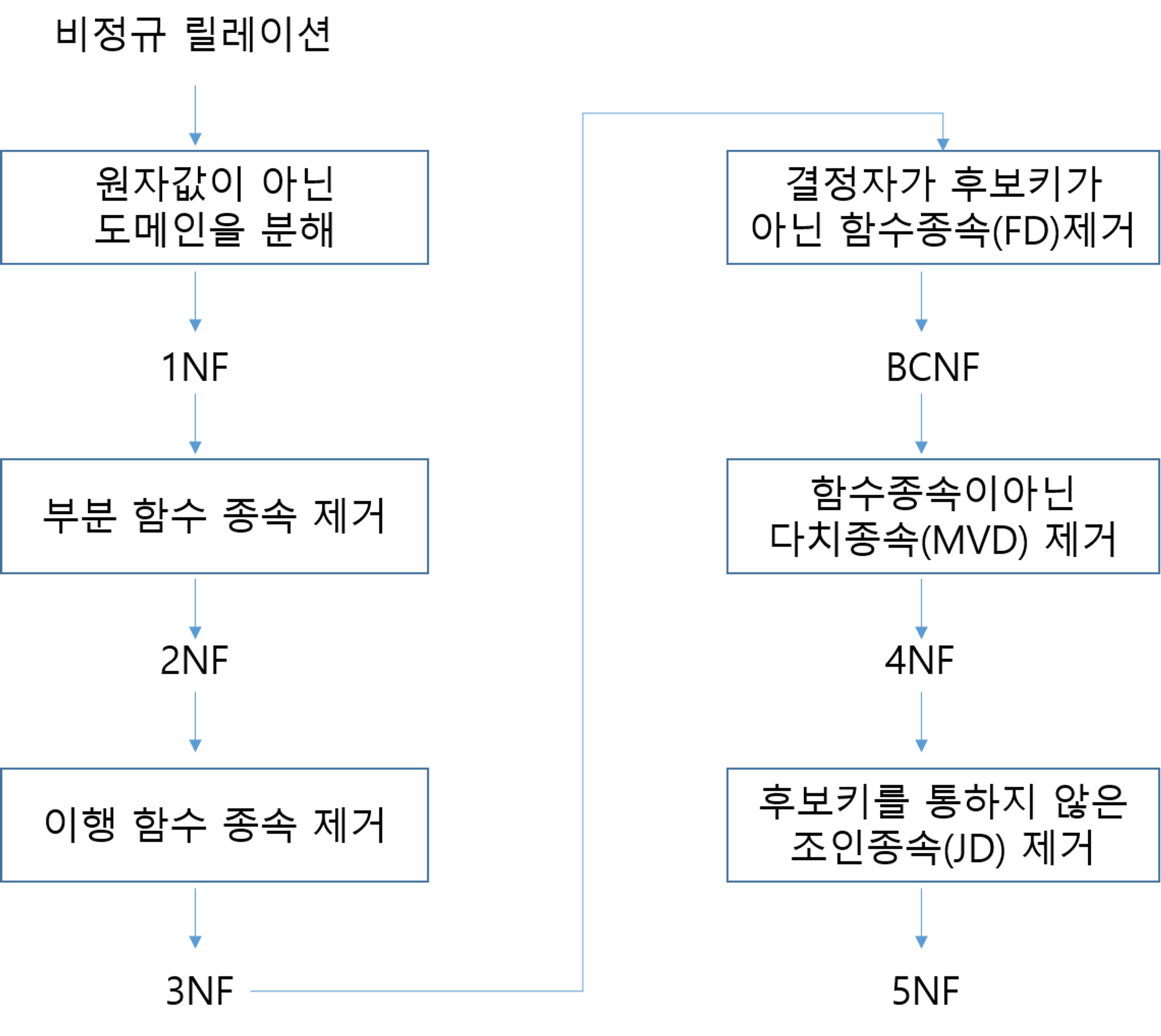 고유한 식별자를 가지는 모든 개체(테이블)에 대해 더 이상 분리할 수 없는 상태로 나누는 과정을 말한다. 정규화 과정을 통해 불필요하게 중복된 데이터 제거 작업을 하게 된다.